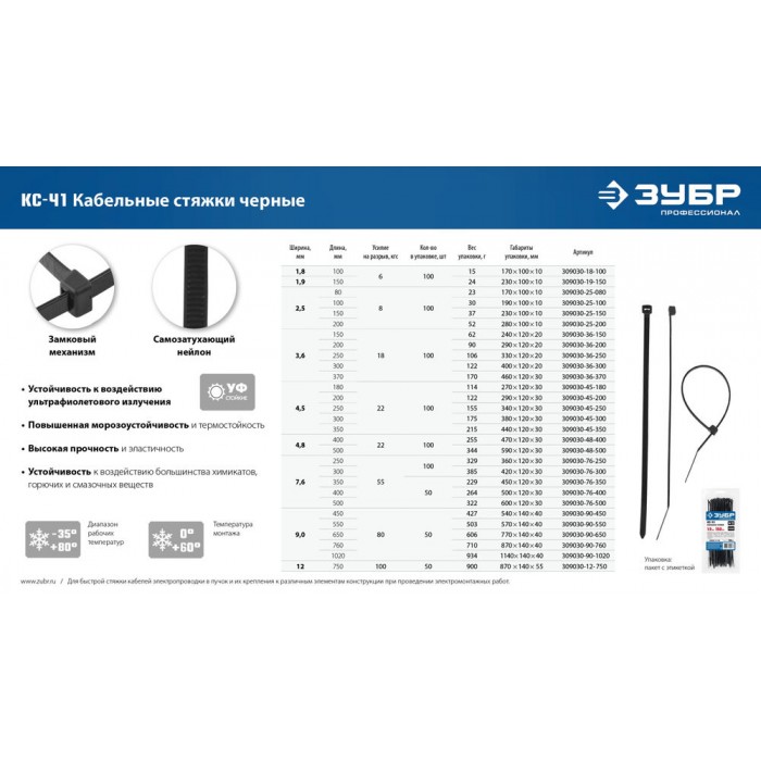 • Диапазон рабочих температур от -35°С до +80°С допускает использование стяжек в самых разнообразных условиях. Монтаж должен производится при температуре от -0°С до +60°С