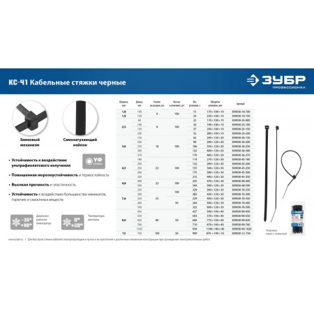 • Диапазон рабочих температур от -35°С до +80°С допускает использование стяжек в самых разнообразных условиях. Монтаж должен производится при температуре от -0°С до +60°С