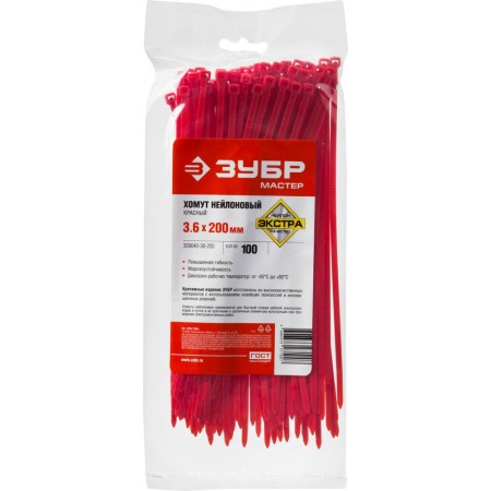 Кабельные стяжки КС-К1, 3.6 x 200 мм, нейлон РА66, 100 шт, красные ЗУБР Профессионал 309040-36-200