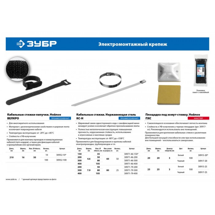 Электромонтажный крепеж предназначен для стяжки кабелей и проводов в пучки, а также крепления электропроводки к различным поверхностям. Стяжки, клипсы, дюбель-хомуты и монтажные площадки легко, быстро и удобно монтировать как внутри, так и вне помещений. Нержавеющие стяжки имеют широчайший спектр применения при проведении строительных и ремонтных работ. Замковый механизм стяжки оснащен шариком со специально обработанной поверхностью, что минимизирует усилие при затяжке и исключает обратное проскальзывание ленты. Полностью металлическая конструкция из нержавеющей стали допускает использование в агрессивных средах, в условиях повышенной влажности и вибрации, при сильных перепадах температур и т.п..