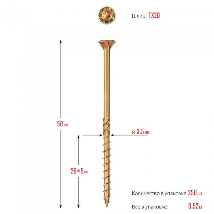 Конструкционный саморез КС-П, 50 х 3.5 мм, TX20, потайная головка, желтый цинк, 250 шт ЗУБР Профессионал 30041-35-050