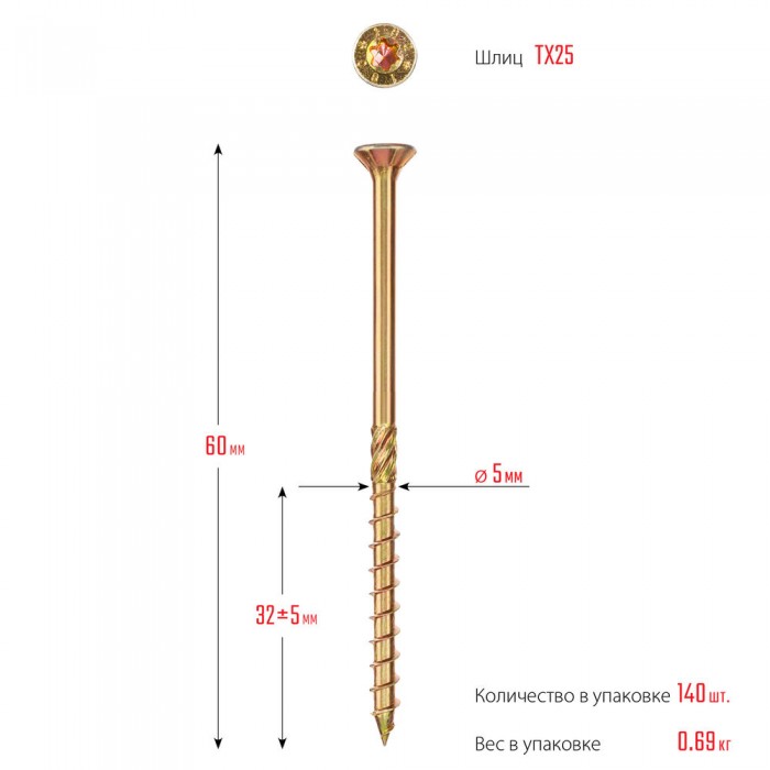 Конструкционный саморез КС-П, 60 х 5.0 мм, TX25, потайная головка, желтый цинк, 140 шт ЗУБР Профессионал 30041-50-060