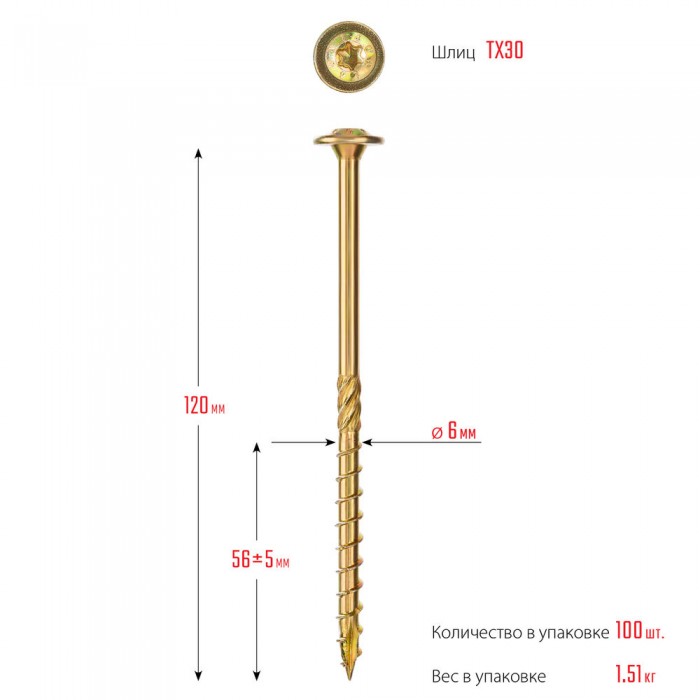 Конструкционный саморез КС-Т, 120 х 6.0 мм, TX30, тарельчатая головка, желтый цинк, 100 шт ЗУБР Профессионал 30051-60-120