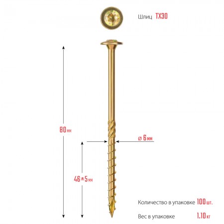 Конструкционный саморез КС-Т, 80 х 6.0 мм, TX30, тарельчатая головка, желтый цинк, 100 шт ЗУБР Профессионал 30051-60-080
