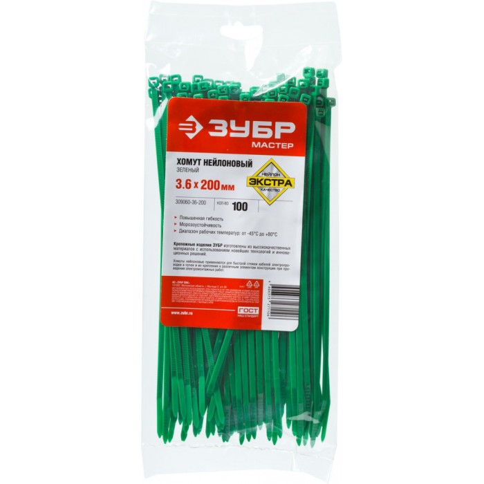 Кабельные стяжки КС-З1, 3.6 x 200 мм, нейлон РА66, 100 шт, зеленые ЗУБР Профессионал 309060-36-200