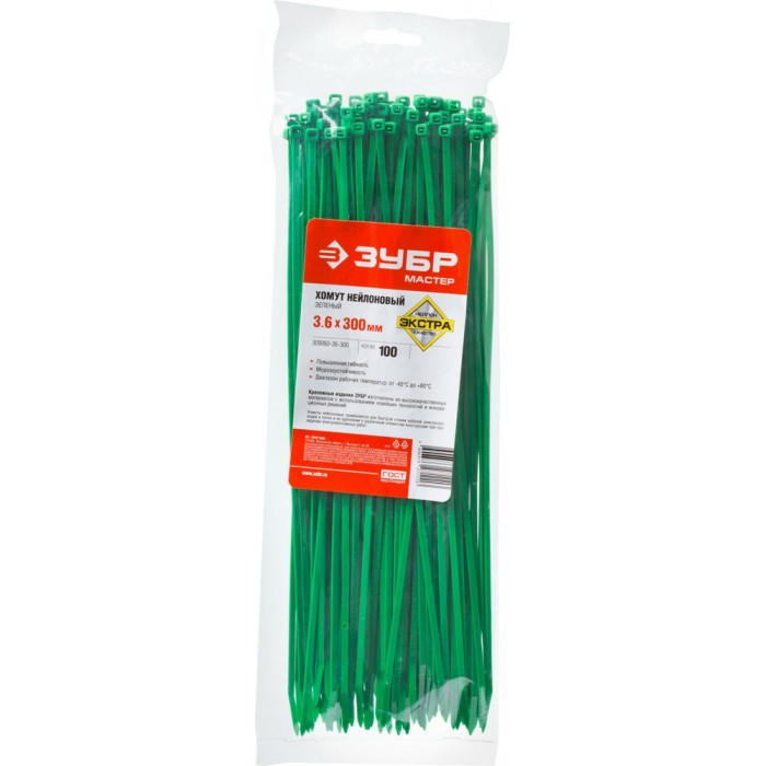 Кабельные стяжки КС-З1, 3.6 x 300 мм, нейлон РА66, 100 шт, зеленые ЗУБР Профессионал 309060-36-300