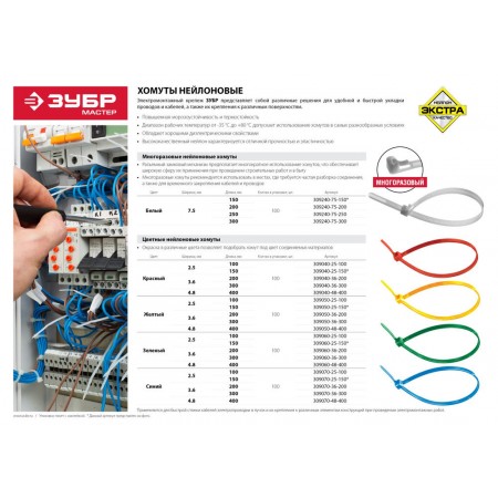 Для быстрой стяжки кабелей электропроводки в пучок и их крепления к различным элементам конструкции при проведении электромонтажных работ.