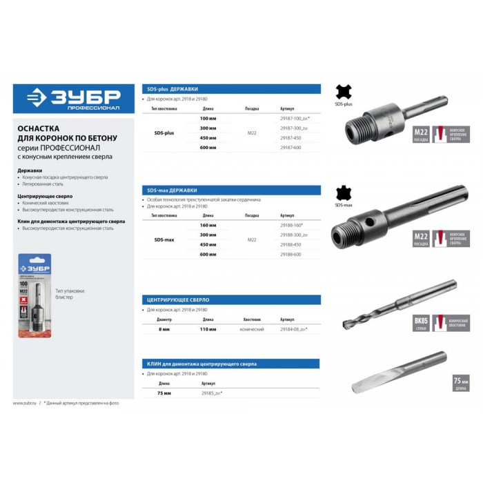 Коронки по бетону используются совместно с державками и центрирующими сверлами. Широкий ассортимент оснастки ЗУБР позволяет реализовать самые сложные задачи в работе по бетону, камню и кирпичу.