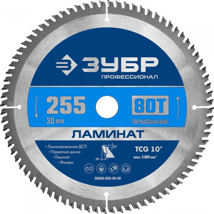 Пильный диск по ламинату Ламинат, 255 х 30 мм, 80Т ЗУБР Профессионал 36930-255-30-80