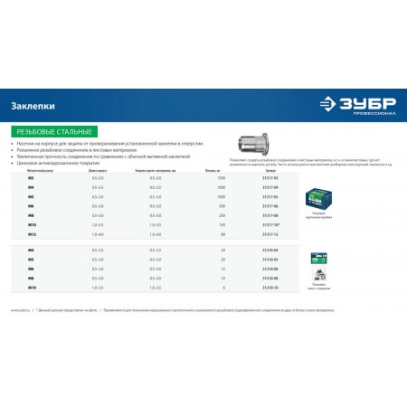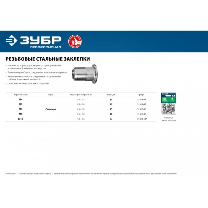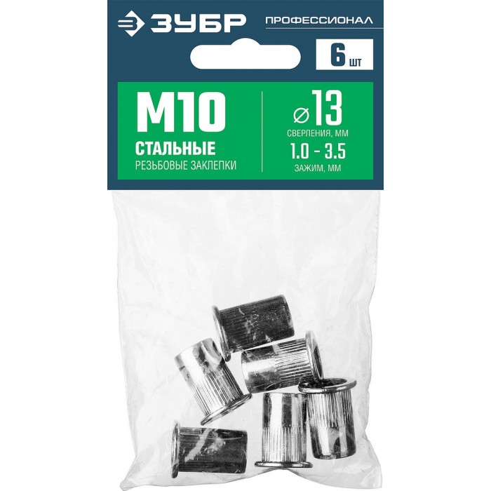 Стальные резьбовые заклепки с насечками М10, стандартный бортик, 6 шт ЗУБР Профессионал 31318-10