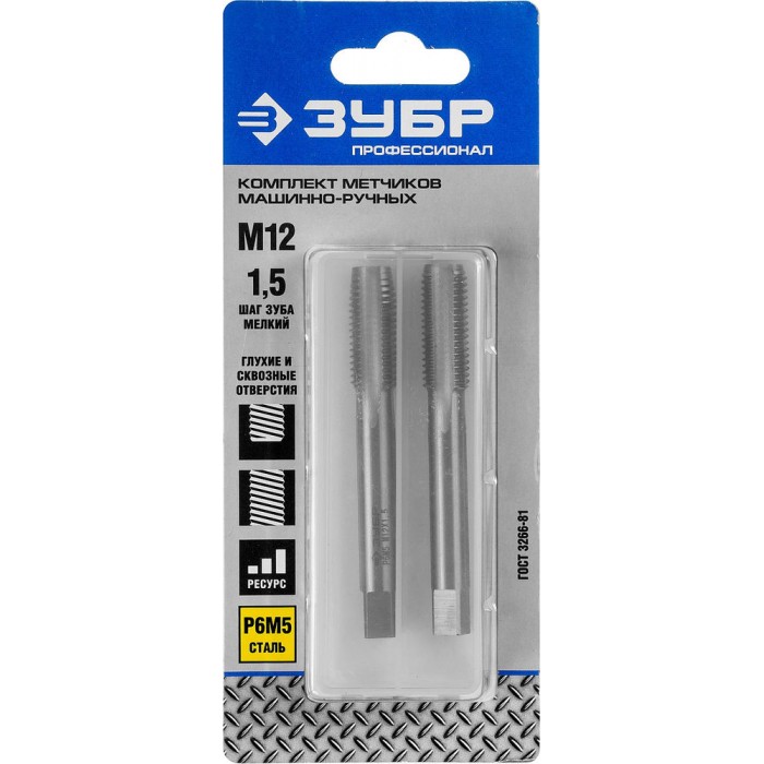 Комплект машинно-ручных метчиков сталь Р6М5 Профессионал ЗУБР М12 x 1.5 мм 4-28007-12-1.5-H2