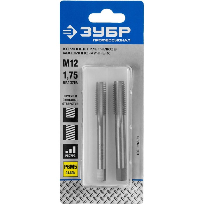 Комплект машинно-ручных метчиков сталь Р6М5 Профессионал ЗУБР М12 x 1.75 мм 4-28007-12-1.75-H2