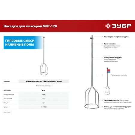 Насадка-миксер М14, d120 мм, для гипсовых смесей и наливных полов ЗУБР МНГ-120