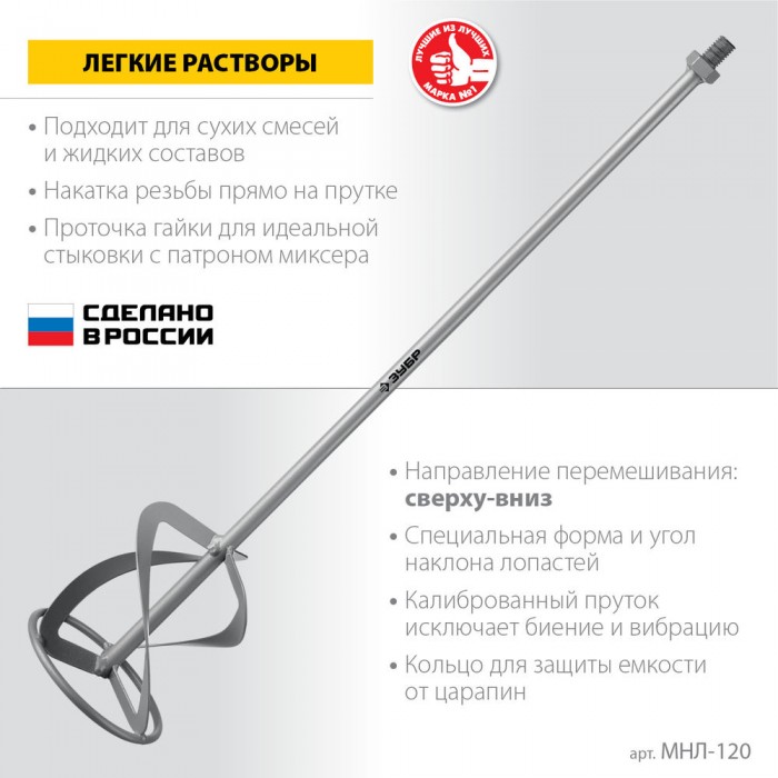 Насадка с лопастями для перемешивания легких растворов (краска, грунтовка, штукатурка, наливной пол, затирка). Используется совместно с ручными миксерами ЗУБР ЗМР-1200Э-1, МР-1050-1, МР-1100, МР-1400-2 и МР-1600-2. Сделано в России