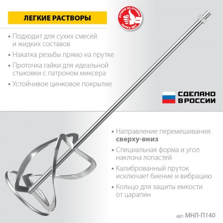 Насадка с лопастями для перемешивания легких растворов (краска, грунтовка, штукатурка, наливной пол, затирка). Используется совместно с ручными миксерами ЗУБР ЗМР-1200Э-1, МР-1050-1, МР-1100, МР-1400-2 и МР-1600-2. Не поддается коррозии и не деформируется даже при эксплуатации в тяжелых условиях. Сделано в России