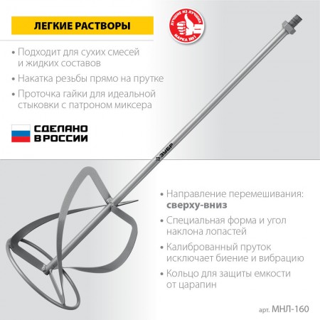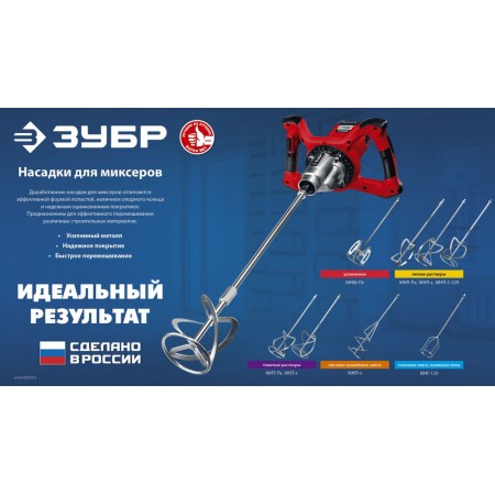 Насадка с лопастями для перемешивания легких растворов (краска, грунтовка, штукатурка, наливной пол, затирка). Используется совместно с ручными миксерами ЗУБР ЗМР-1200Э-1, МР-1050-1, МР-1100, МР-1400-2 и МР-1600-2. Сделано в России