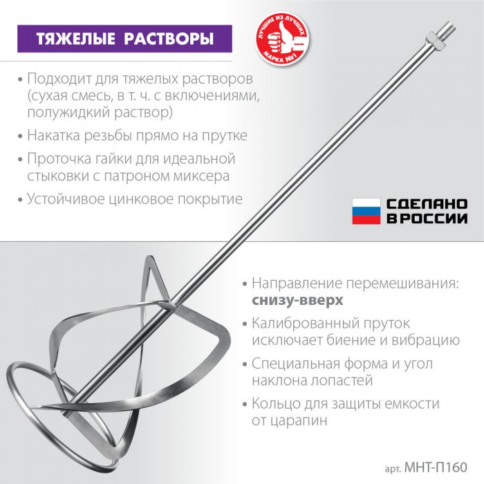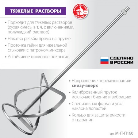 Насадка с лопастями для перемешивания тяжелых растворов (бетон, гипс, стяжка, смола, плиточный клей, известково-глиняный раствор). Используется совместно с ручными миксерами ЗУБР ЗМР-1200Э-1, МР-1050-1, МР-1100, МР-1400-2 и МР-1600-2. Не поддается коррозии и не деформируется даже при эксплуатации в тяжелых условиях. Сделано в России
