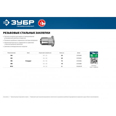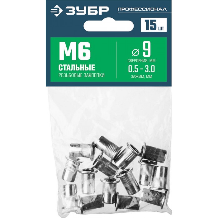 Стальные резьбовые заклепки с насечками М6, стандартный бортик, 15 шт ЗУБР Профессионал 31318-06
