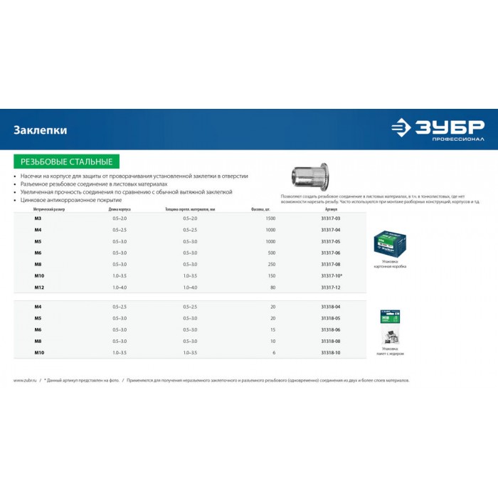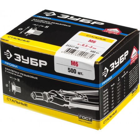 Стальные резьбовые заклепки с насечками М6, стандартный бортик, 500 шт ЗУБР Профессионал 31317-06