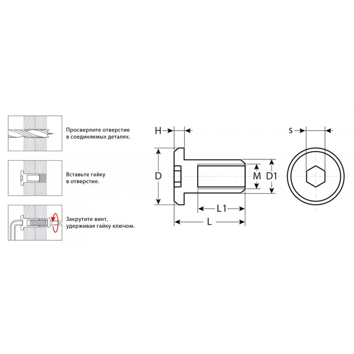 Для создания разъемного резьбового соединения в мебельном производстве, стяжки деталей и конструкций. Гайка устанавливается в заранее подготовленное отверстие, равное или чуть больше внешнего диаметра гайки. Фиксация гайки происходит при помощи винта с метрической резьбой. Для затягивания соединения используется торцевой шестигранный ключ.