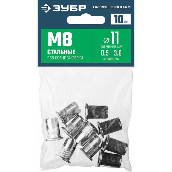 Стальные резьбовые заклепки с насечками М8, стандартный бортик, 10 шт ЗУБР Профессионал 31318-08