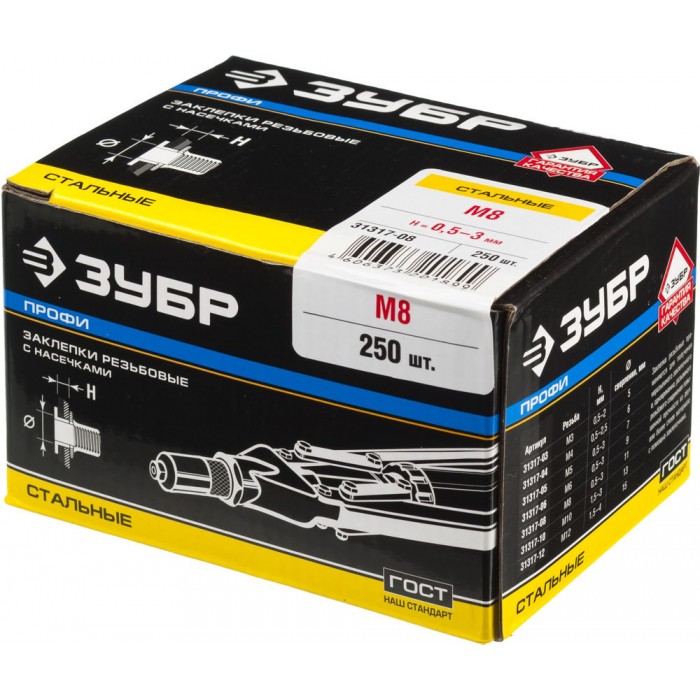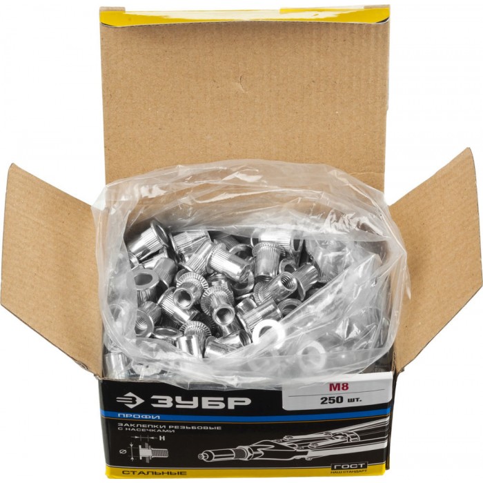 Стальные резьбовые заклепки с насечками М8, стандартный бортик, 250 шт ЗУБР Профессионал 31317-08