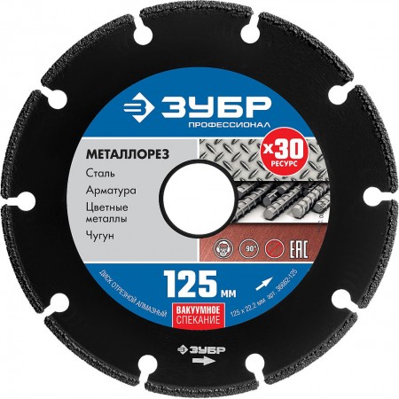 Алмазный диск по металлу МЕТАЛЛОРЕЗ 125 мм, вакуумное спекание ЗУБР Профессионал 36662-125