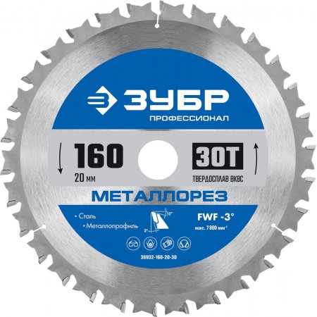 Пильный диск по металлу и металлопрофилю Металлорез, 160 х 20 мм, 30Т ЗУБР Профессионал 36932-160-20-30