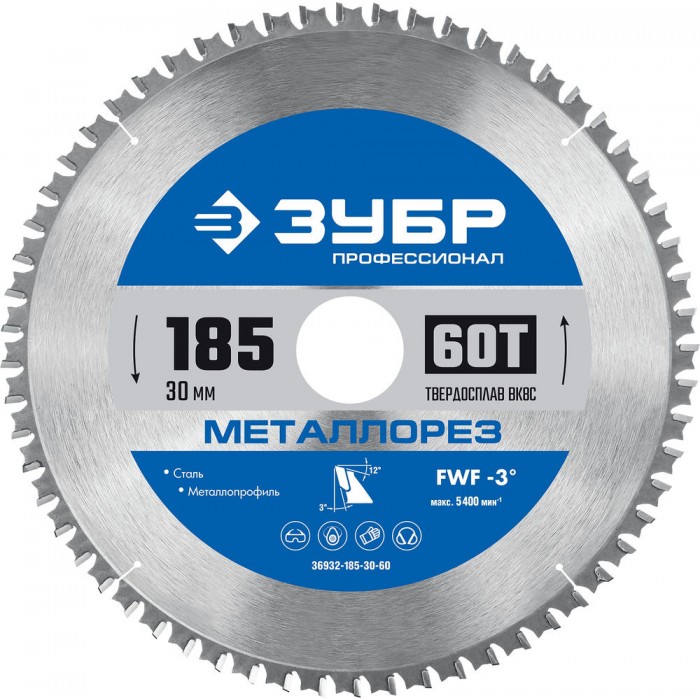 Пильный диск по металлу и металлопрофилю Металлорез, 185 х 30 мм, 60Т ЗУБР Профессионал 36932-185-30-60
