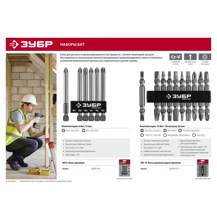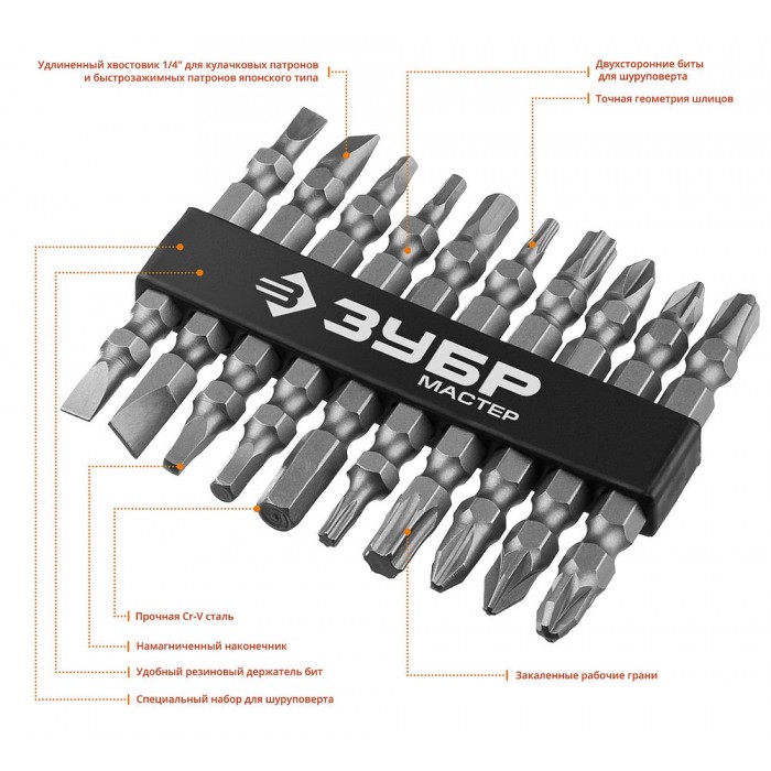Профессиональные биты ЗУБР для ручного и механизированного инструмента изготовлены из высококачественной стали и имеют точную геометрию шлицов, что обеспечивает длительный срок службы.