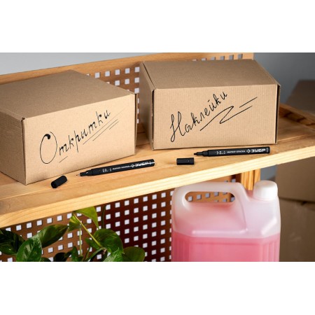 Универсальный маркер с жидкой быстросохнущей краской подходит практически для любой поверхности. Практичеcки безопасен для человека, поскольку не имеет в составе токсичных веществ, таких как ксилол. Данный маркер не смывается водой, не выгорает на солнце и устойчив к температурным перепадам.