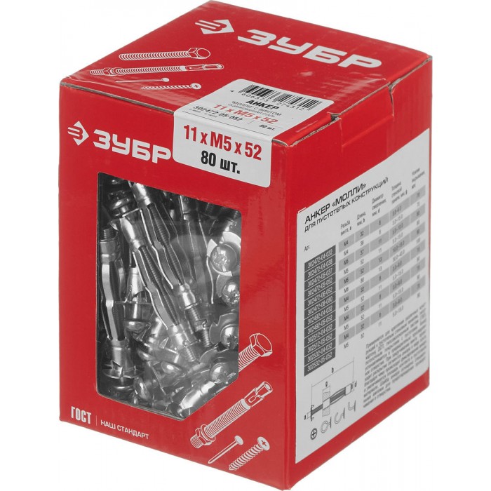 Анкер для пустотелых конструкций МОЛЛИ, М5 х 52 х 11 мм, 80 шт ЗУБР 302472-05-052