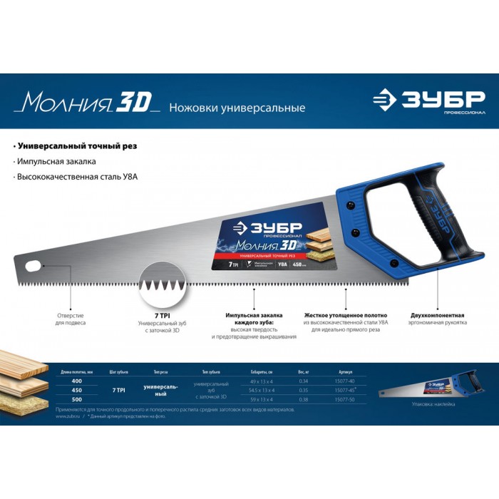 Ножовка универсальная Молния-3D, 500 мм, 7 TPI ЗУБР Профессионал 15077-50_z01