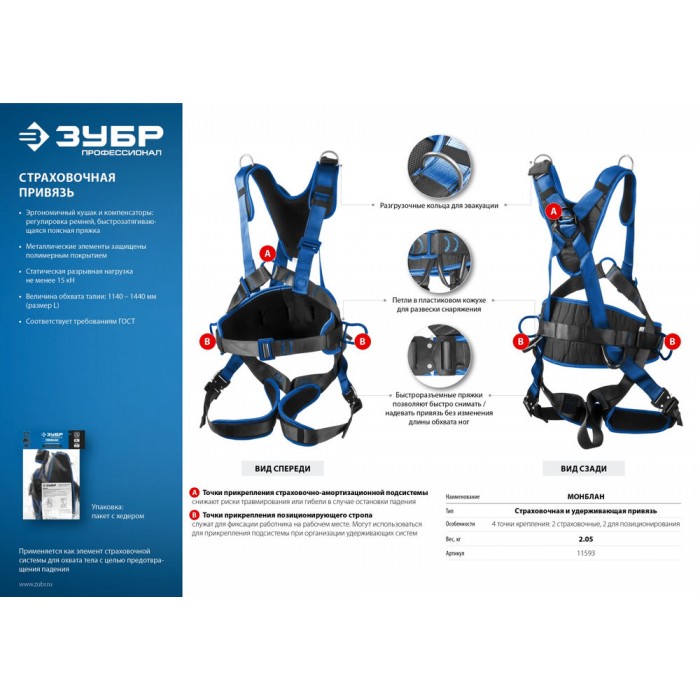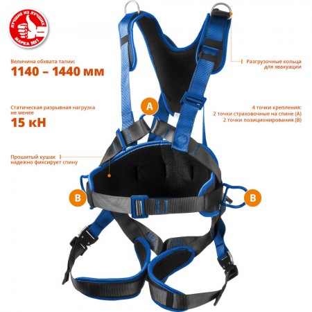 Привязь страховочная и удерживающая МОНБЛАН, стальная фурнитура с полимерным покрытием, 4 точки крепления, размер L (1140-1440) ЗУБР Профессионал 11593