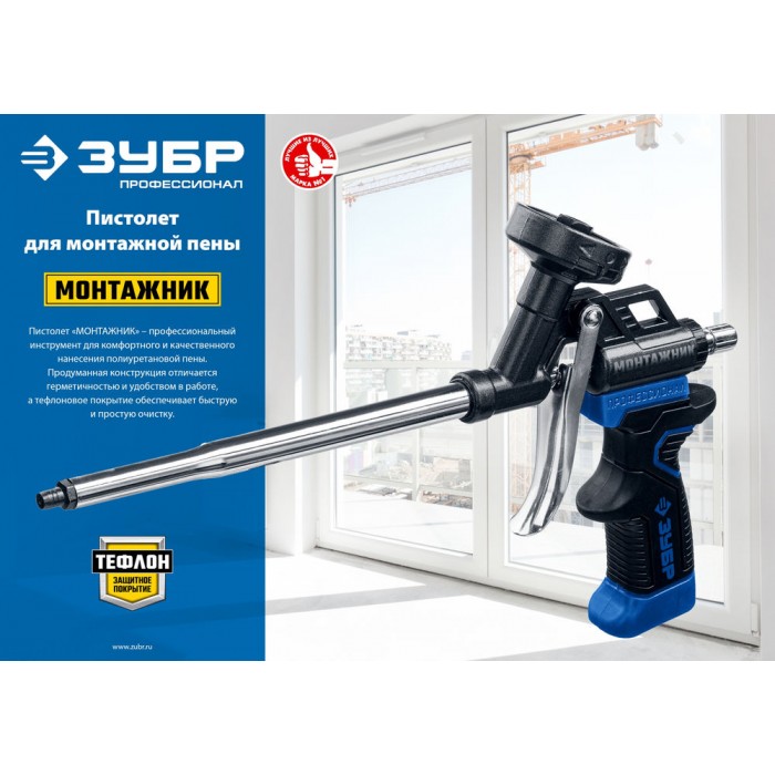Пистолет для монтажной пены МОНТАЖНИК это инновационный инструмент, предназначенный для профессионального применения, отличающийся герметичностью, высокой надёжностью и удобством в работе. Инструмент имеет тефлоновое покрытие корпуса и сопла , что обеспечивает быструю и простую очистку.