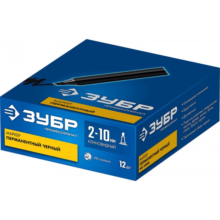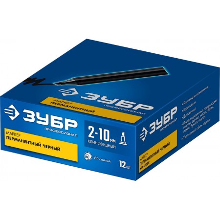 Маркер перманентный с клиновидным наконечником. Экстра-большой объем заливаемых чернил делает данный маркер самым долговечным среди перманентных маркеров ЗУБР. Так как перманентный маркер пишет практически на любой поверхности, он применяется в различных сферах, где требуется нанести надпись, рисунок, знак или указатель.