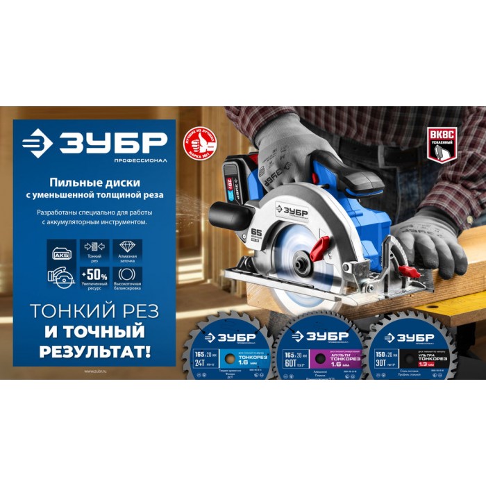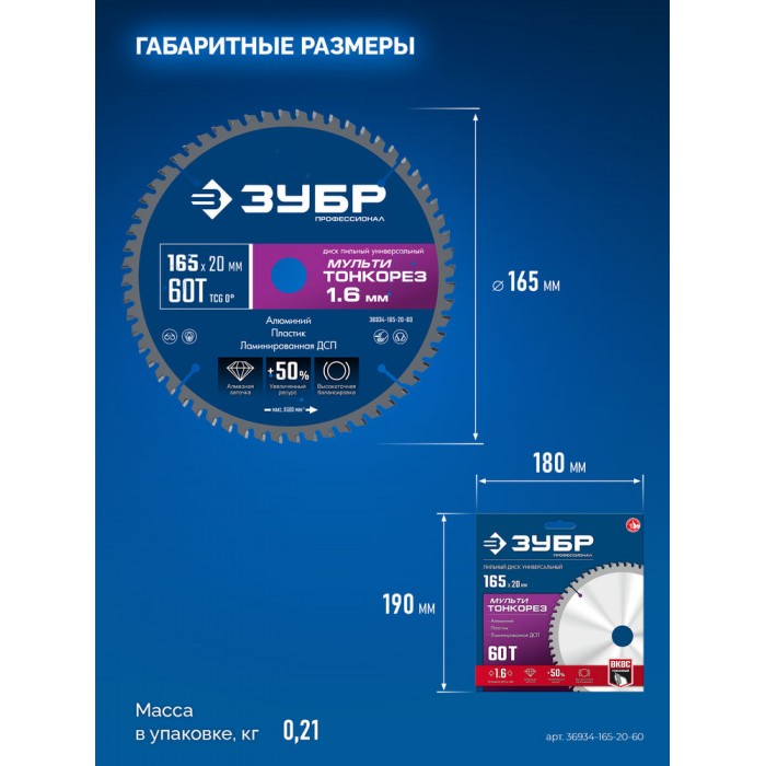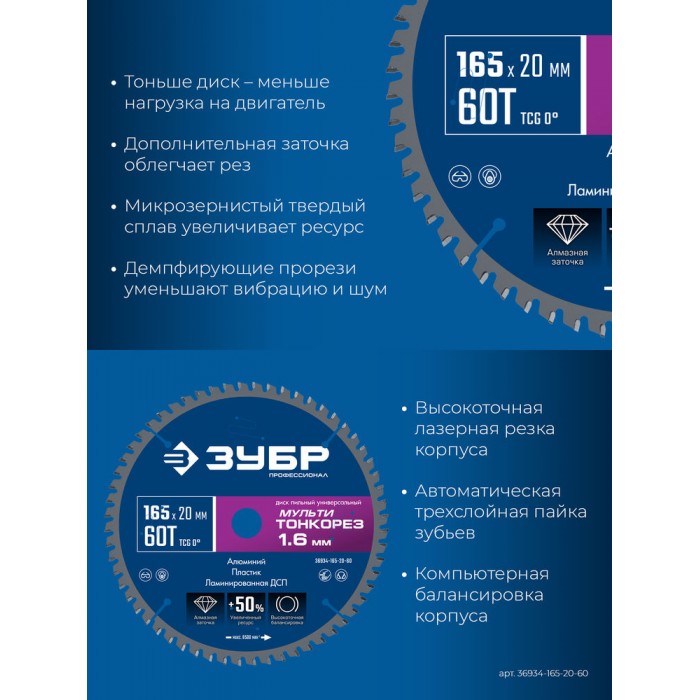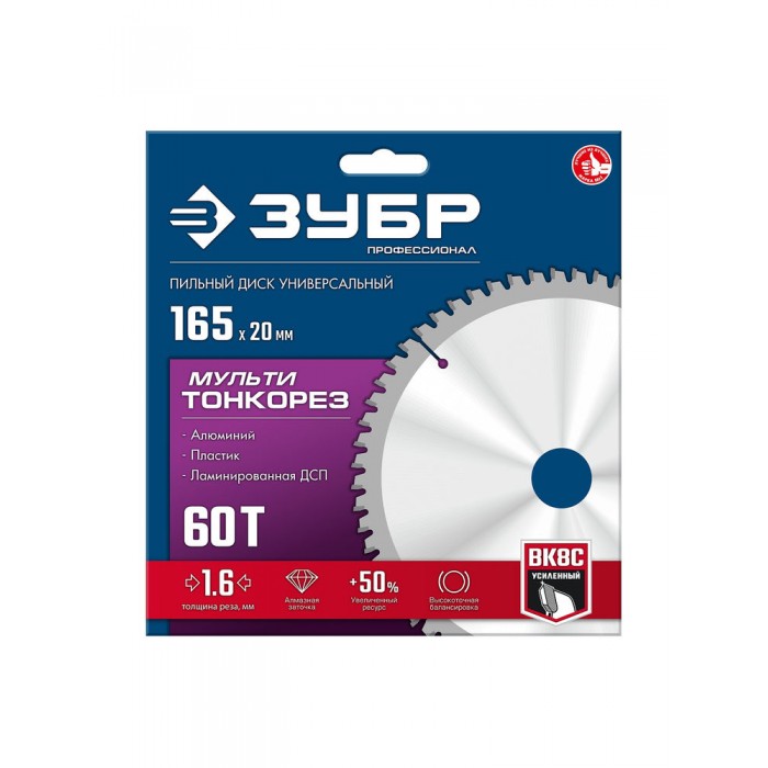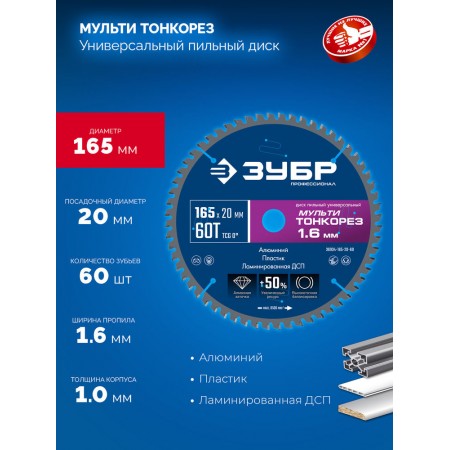 Диск пильный универсальный тонкий рез Мульти Тонкорез 165 х 20 х 1.6 мм, 60Т ЗУБР Профессионал 36934-165-20-60
