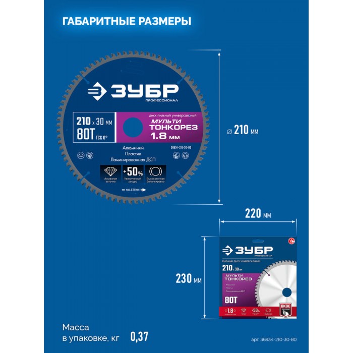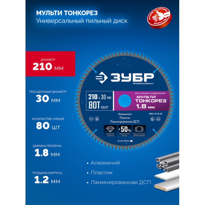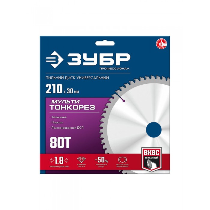 Диск пильный универсальный тонкий рез Мульти Тонкорез 210 х 30 х 1.8 мм, 80Т ЗУБР Профессионал 36934-210-30-80
