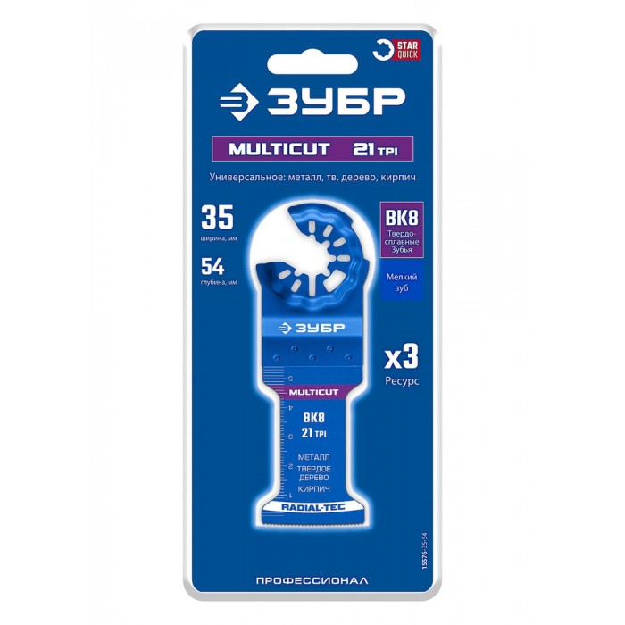 Полотно универсальное MULTICUT ВК8 21TPI, 35 x 54 мм, с твердосплавными зубьями: металл, твёрдое дерево, кирпич ЗУБР StarQuick 15576-35-54