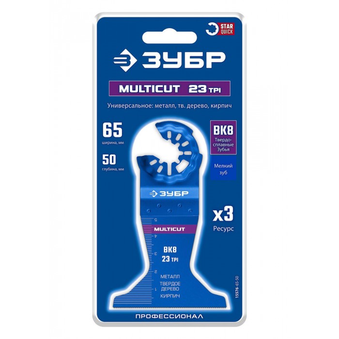 Полотно универсальное MULTICUT ВК8 23TPI, 65 x 50 мм, с твердосплавными зубьями: металл, твёрдое дерево, кирпич ЗУБР StarQuick 15576-65-50