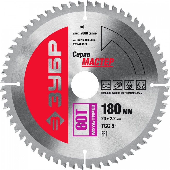 ЗУБР Мультирез, 180 x 20 мм, 60Т, пильный диск по алюминию (36916-180-20-60)