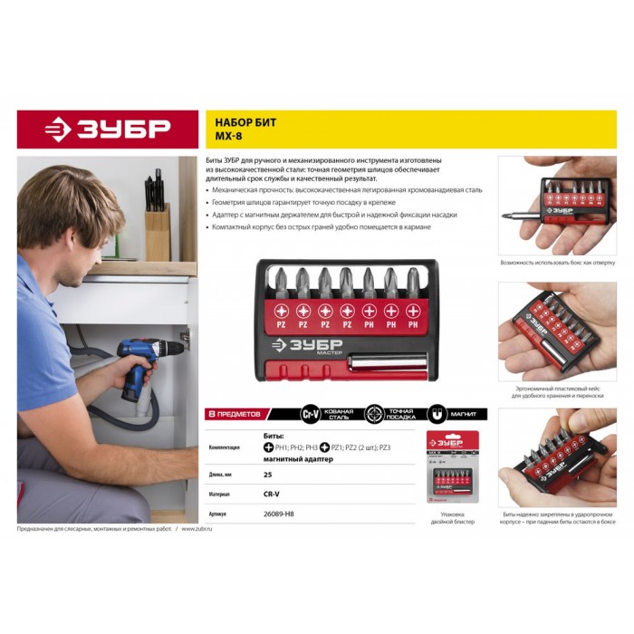 Набор бит Зубр предназначен для монтажа и демонтажа резьбовых соединений.