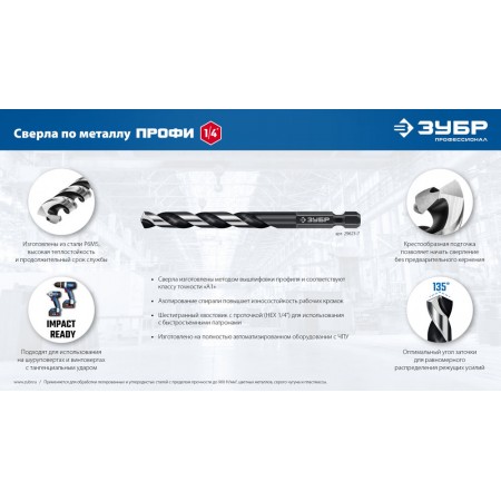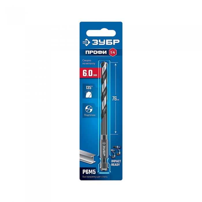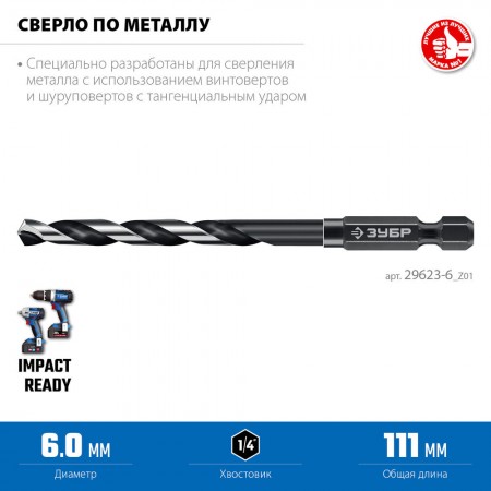 Сверло по металлу НЕХ-1/4", d 6.0 х 111 мм, для винтовёртов и шуруповертов IMPACT READY ЗУБР 29623-6_z01