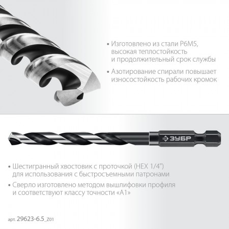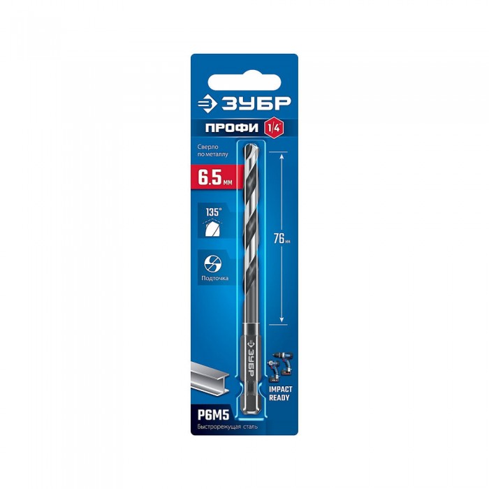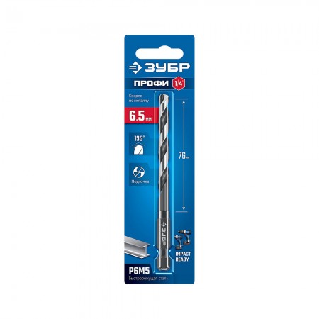 Сверло по металлу НЕХ-1/4", d 6.5 х 119 мм, для винтовёртов и шуруповертов IMPACT READY ЗУБР 29623-6.5_z01