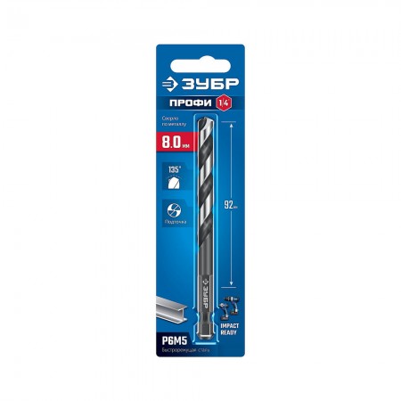 Сверло по металлу НЕХ-1/4", d 8.0 х 117 мм, для винтовёртов и шуруповертов IMPACT READY ЗУБР 29623-8_z01