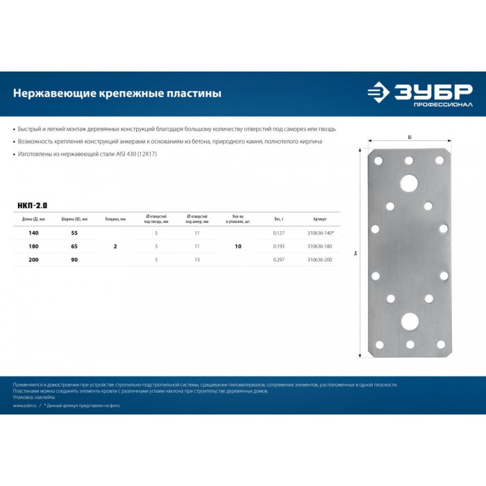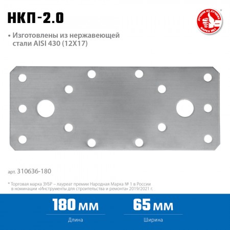 Крепежная пластина нержавеющая НКП-2.0, 180 x 65 x 2 мм ЗУБР Профессионал 310636-180