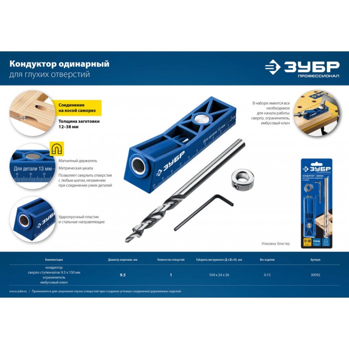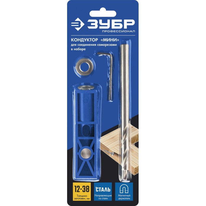 Использование кондукторов значительно упрощает процесс соединения деревянных деталей. Кондуктор предназначен для сверления глухих отверстий и точно позиционирует ступенчатое сверло. Глухое отверстие имеет внутри специальный профиль - больший диаметр на входе, ступенька, меньший диаметр на выходе. Ступенька в глубине глухого отверстия служит опорной поверхностью для головки самореза, обеспечивая прочное соединение деталей. Достаточно просверлить отверстия только в одной из соединяемых деталей и стянуть детали специальными саморезами для глухих отверстий. При выборе самореза нужно учитывать толщину соединяемых деталей.