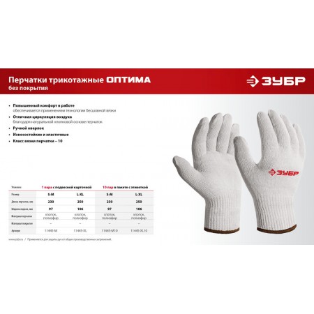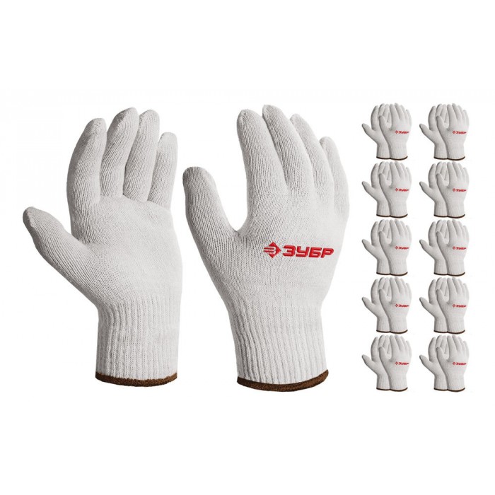 Перчатки х/б ОПТИМА, L-XL, без покрытия, 10 класс, 10 пар ЗУБР 11445-XL10