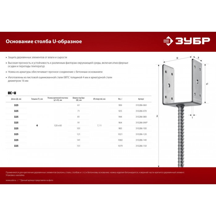Основание столба ОС-U, U-образное, 61 x 120 x 60 мм ЗУБР 310286-060