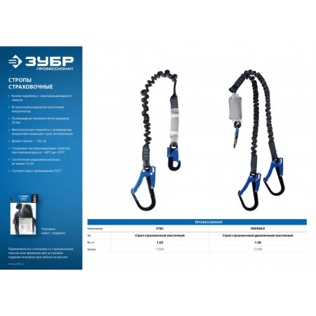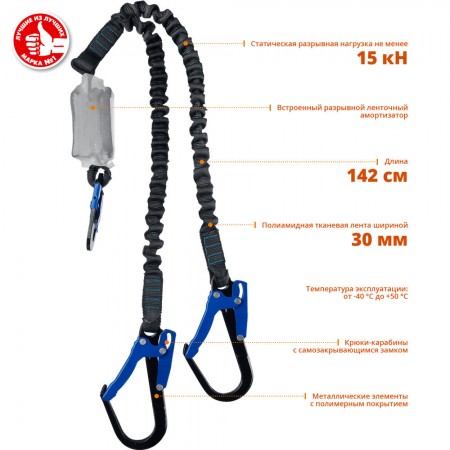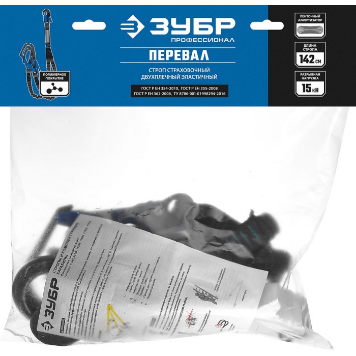 Строп страховочный двухплечный эластичный L 1.42 м разрывной ленточный амортизатор стальные карабины с полимерным покрытием ЗУБР ПЕРЕВАЛ Профессионал 11596